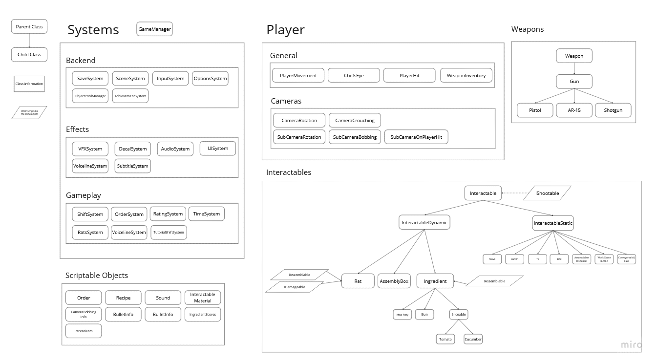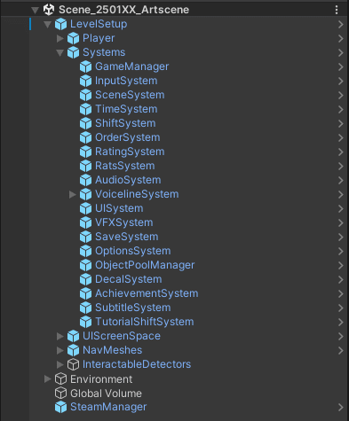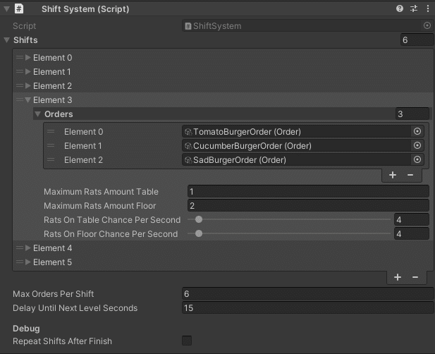 To make the implementation of new ingredients easier for the game designers, the level progression setup is kept straightforward. The ShiftSystem holds a list of all the shifts (levels). Each shift contains several orders and other game-progression-related data, such as the spawn rates of rats.