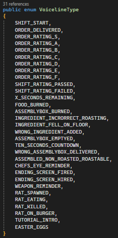 The VoicelineSystem is an extension of our AudioSystem. We have a wide variety of voice lines for the kitchen boss, Joe Hannes, which must be triggered at the right moments. Some voice lines are more important and will cancel any currently playing lines, while others are more flexible, allowing Joe Hannes to comment on the player’s actions.