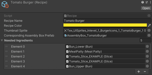 An order is made by a single customer and consists of multiple recipes, which in turn are made up of ingredients. Orders are simply ScriptableObjects containing a list of recipes, and recipes are ScriptableObjects containing a list of ingredients along with some meta-data.