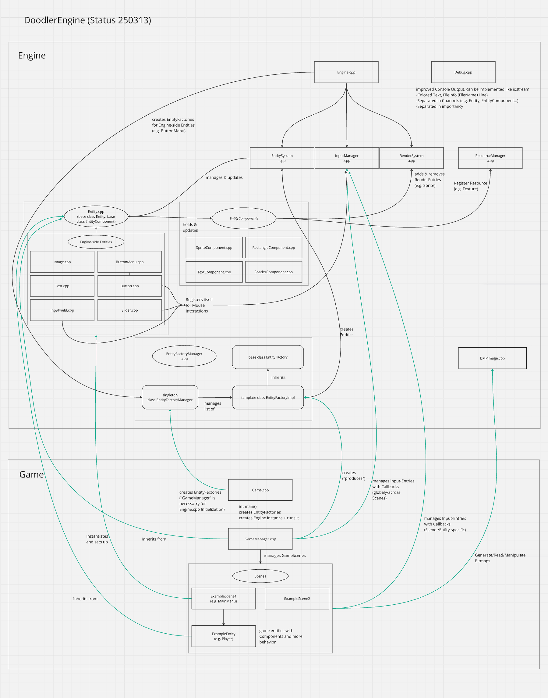 There is no GUI in this engine yet, so as a developer, you need to understand how the engine components work together in order to use them effectively. The visualization above illustrates everything DoodlerEngine offers and how its components are connected (as of the date shown in the image).