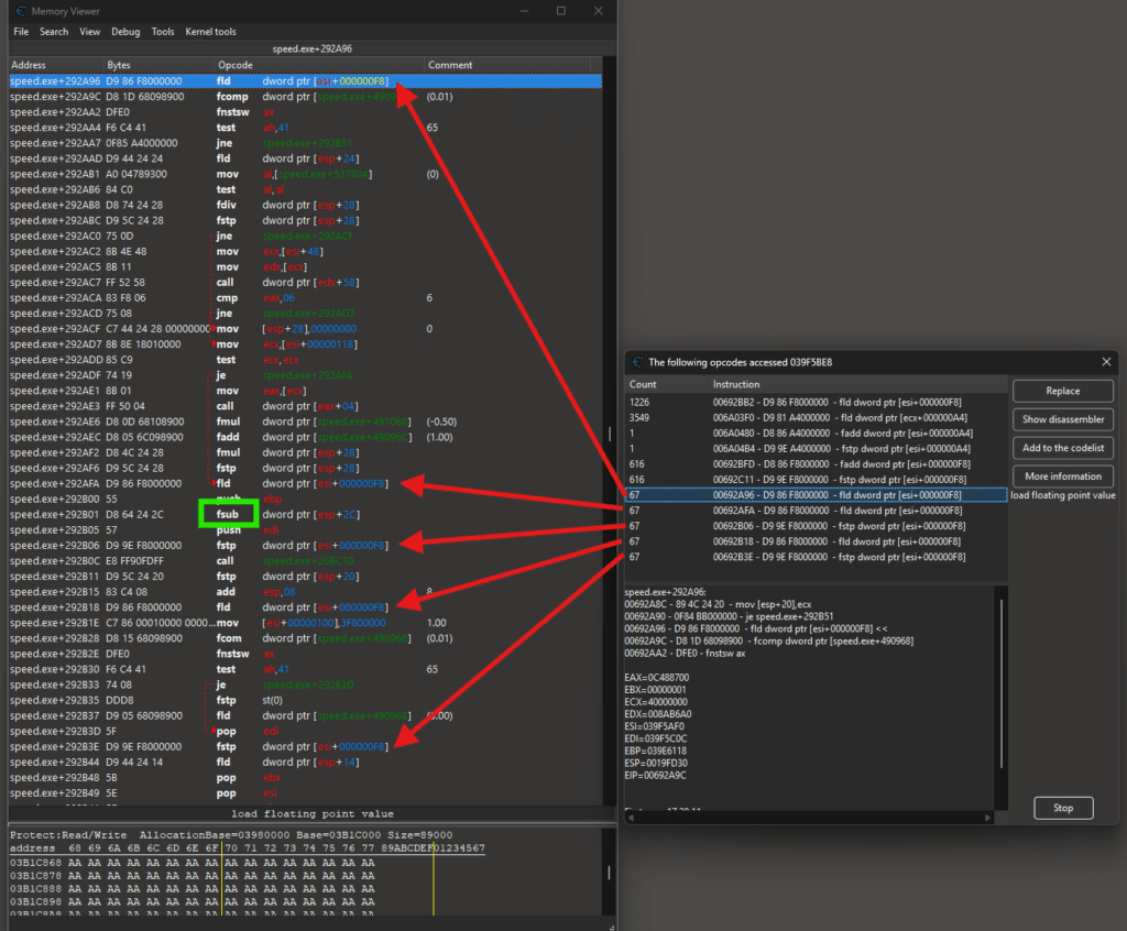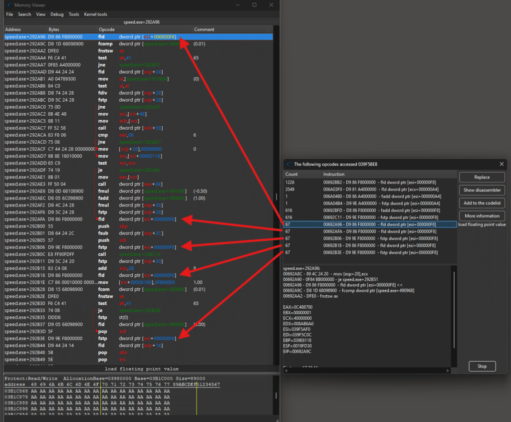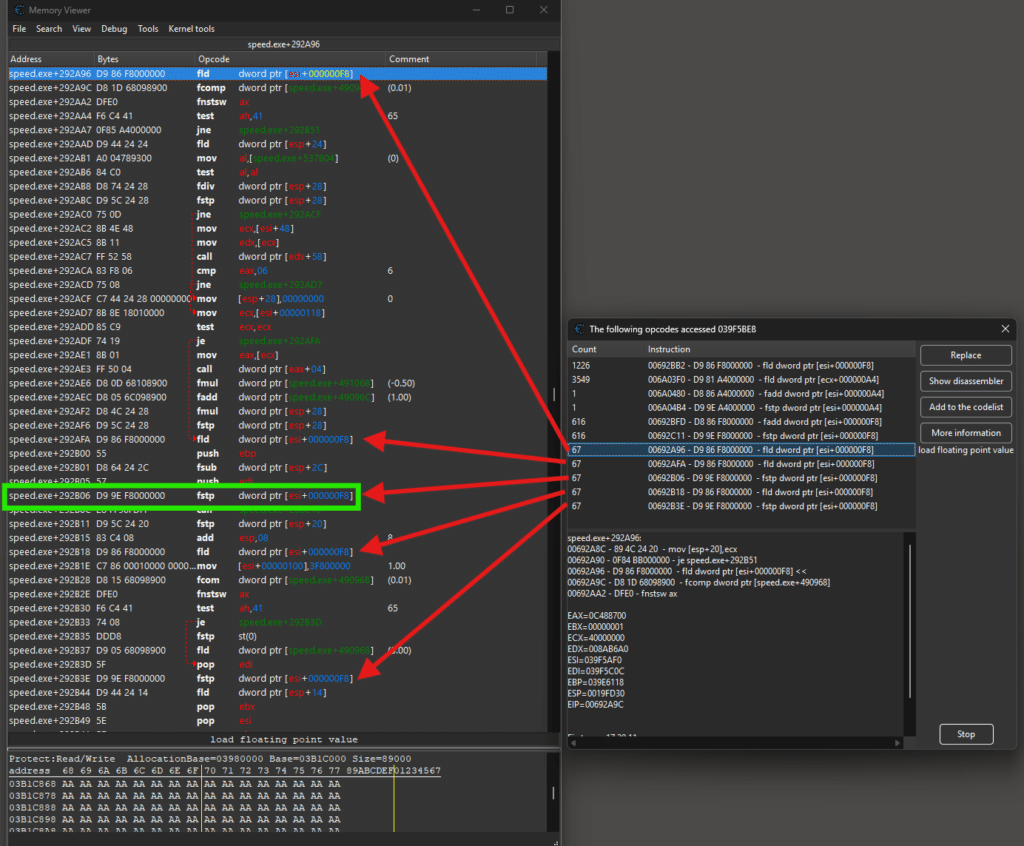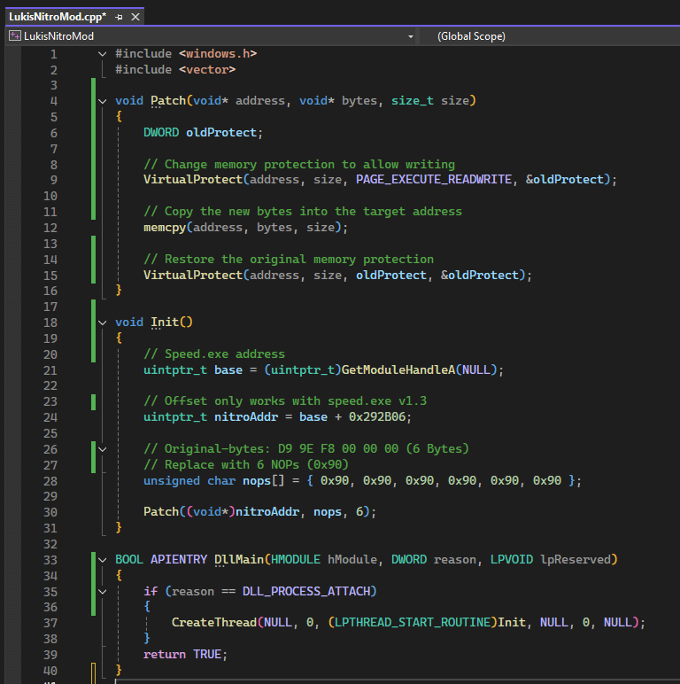 Using this information, we create our own asi-file which then will manipulate the address „speed.exe + 292B06“ at game start to dont write the register-value anymore but do nothing instead. (using „NOPs“ or „Null Operators“)