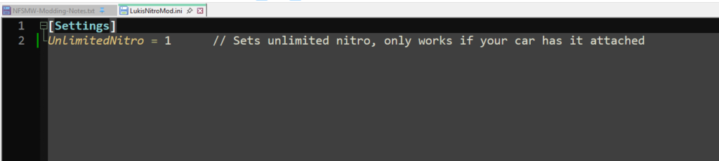 To make the mod complete, I implemented an .ini-file, which the mod-user can use to toggle the unlimited nitro before game start.