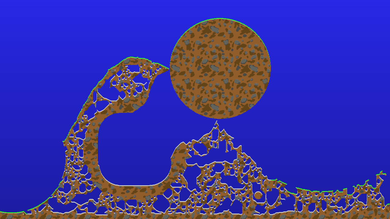 The 2D World Generator creates bitmaps that can be used for games similar to the classic Worms series. It generates random noise patterns, which are then processed using a Cellular Automata algorithm to form tunnel-like structures.